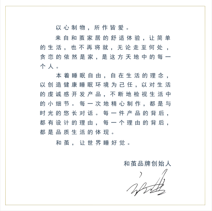 以心制物,所作皆爱。来自和茧家居的舒适体验,让简单的生活,也不再将就,无论走至何处,贪恋的依然是家,是这方天地中的每一个人。本着睡眠自由,自在生活的理念,以创造健康睡眠环境为己任,以对生活的虔诚感开发产品,不断地检视生活中的小细节。每一次地精心制作,都是与时光的悠长对话。每一件产品的背后,都有设计的理由,每一个理由的背后,都是品质生活的体现。和茧,让世界睡好觉。